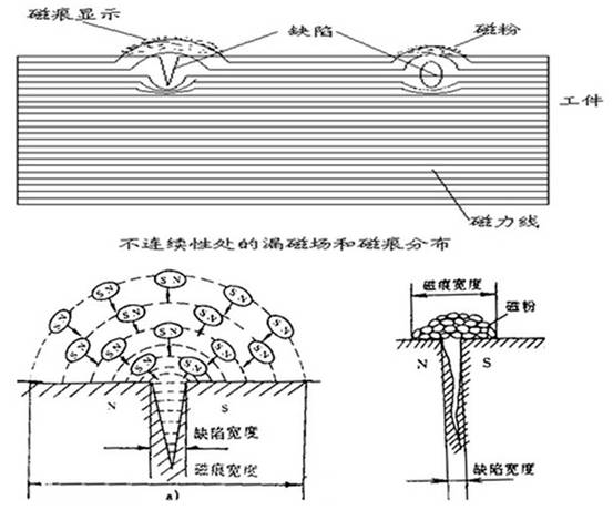 磁粉探伤,是通过磁粉在缺陷附近漏磁场中的堆积以检测铁磁性材料表面或近表面处缺陷的一种无损检测方法。将钢铁等磁性材料制作的工件予以磁化,利用其缺陷部位的漏磁能吸附磁粉的特征,依磁粉分布显示被探测物件表面缺陷和近表面缺陷的探伤方法。该探伤方法的特点是简便、显示直观。